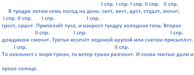 В тундре летом семь погод на день: се..т, ве..т, ду..т, студ..т, моч..т, гре..т, суш..т. Приползёт туча, и накро..т тундру холодная тень. Вторая дождиком2 смоч..т. Третья иссеч..т ледяной крупой или снегом присыпл..т3. То нахлын..т с моря туман, то ветер туман разгон..т. И снова чистые дали и яркое солнце.